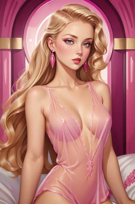 hud_tdy, bare shoulders, pink sleeveless see-through lingerie, nipples, earrings