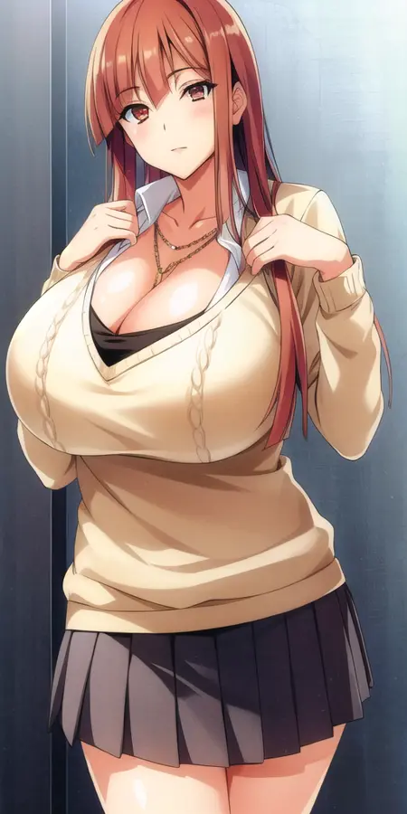 - カーディガン、胸元、プリーツスカート、ローネック、赤いネクタイ、白いシャツ、開いた服