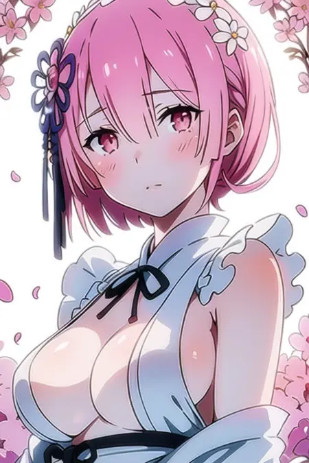📌Prompt:Ram, ram_\(re:zero\), red eyes, short hair, pink hair, hair ornament, hair over one eye, eyes visible through hair, bangs, blush, hair ribbon, ribbon trim, purple ribbon, hairclip