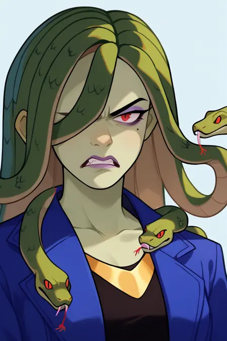 • 角色标签:蛇发,绿色皮肤,怪物女孩,头发遮住一只眼睛,妆容