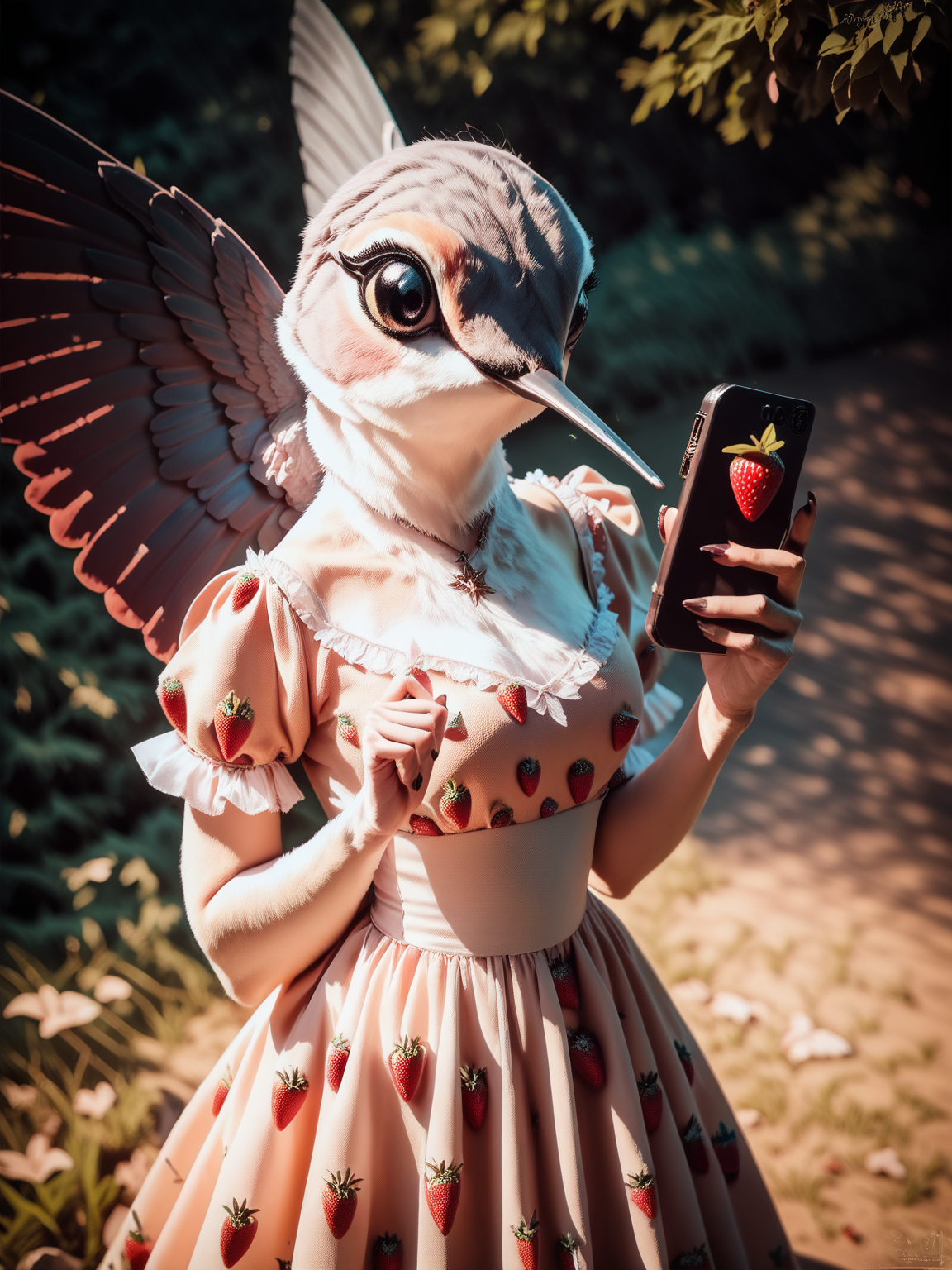 ハチドリ(まれに2つのくちばしや頭と翼が生成されることがある。否定的なプロンプトで修正可)