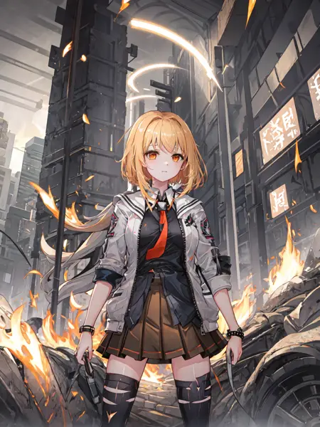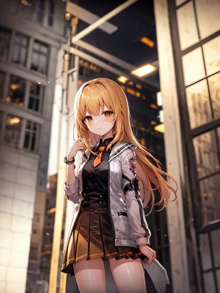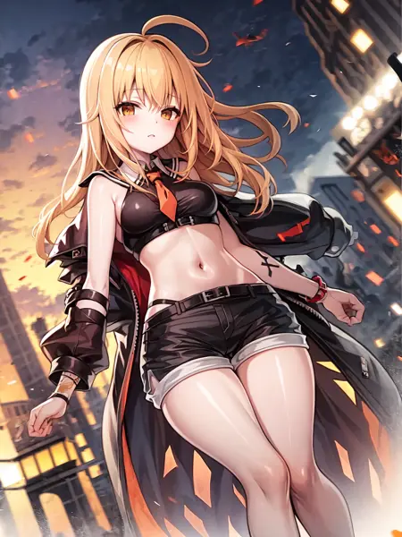 디지어, 벨트, 오렌지 스커트, 배꼽, 모자, 코트,