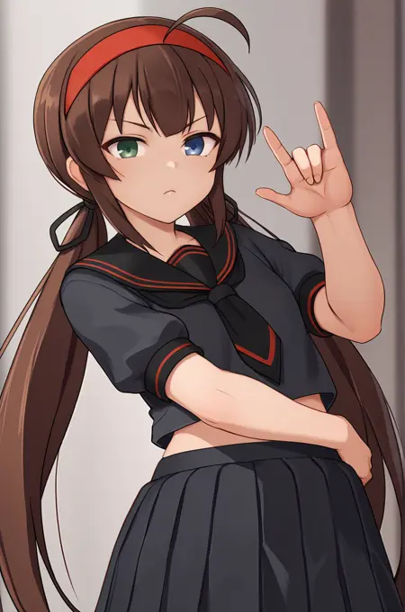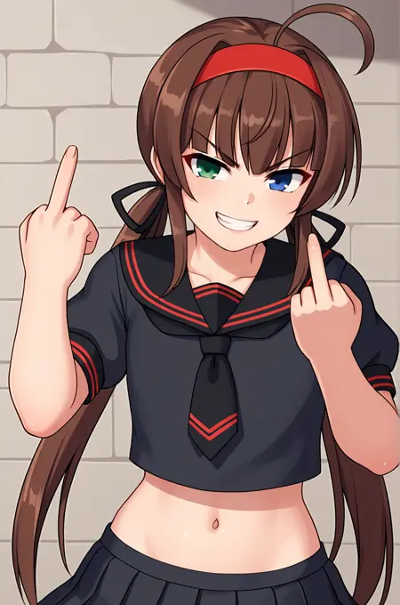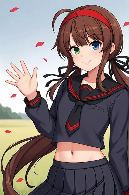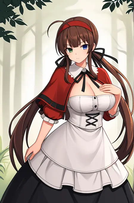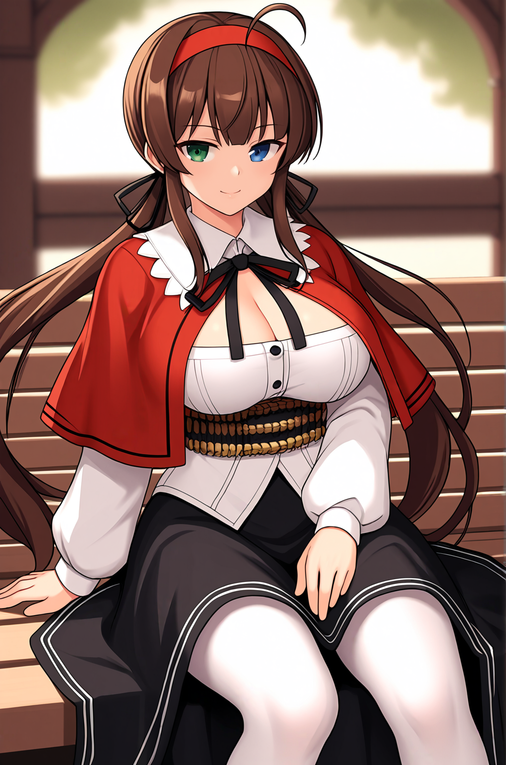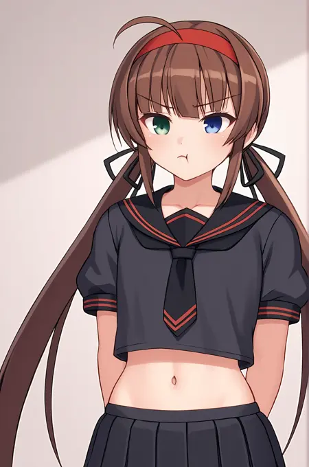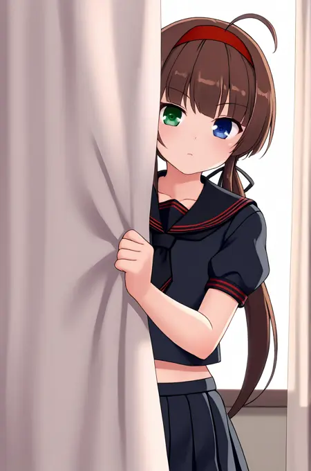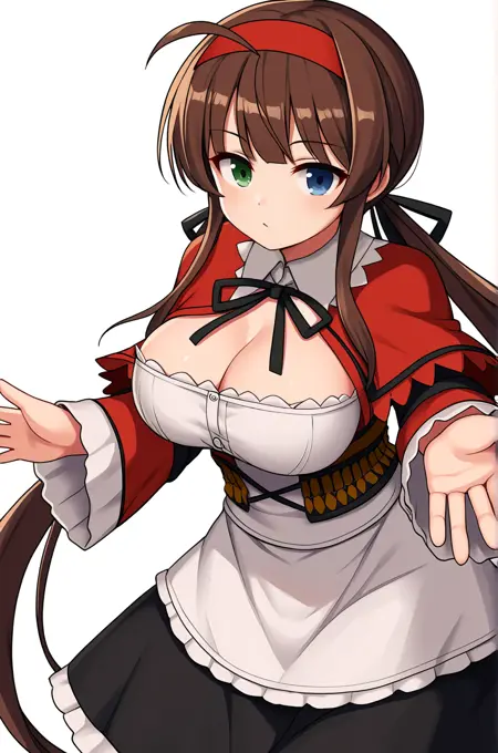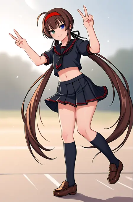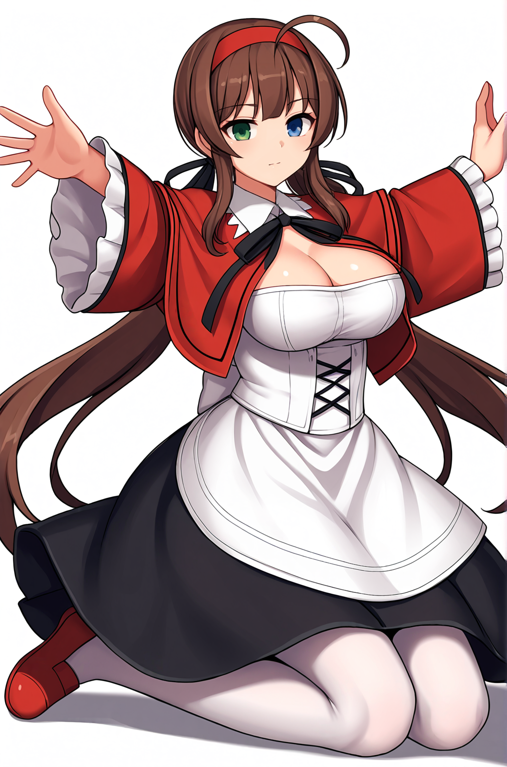 Trigger Word for the LoRA are "Ryoubi_IL, green eye, blue eye, heterochromia, brown hair, very long hair, ahoge, low twintails, red hairband, hair ribbon, flat chest (large breasts),". You need to choose "flat chest" or "large breasts".