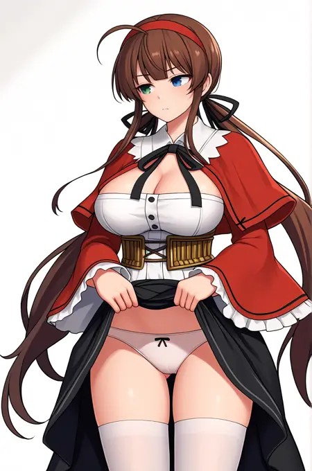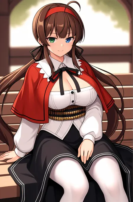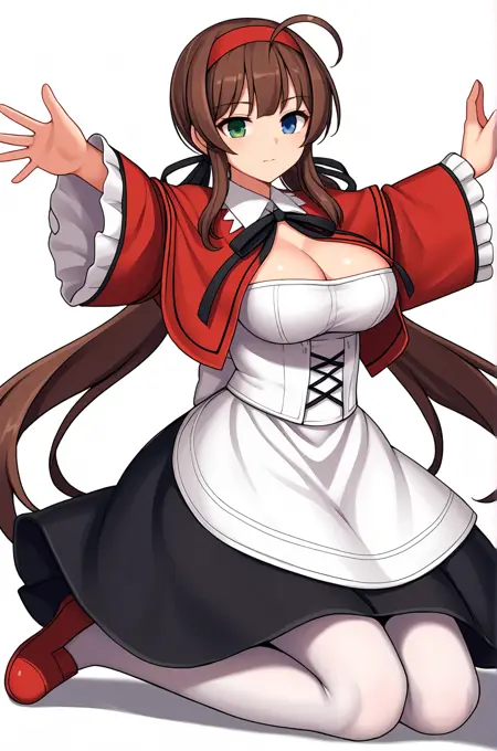 Trigger Words for shinobi outfit are "Ryoubi_Shinobi, red capelet, white dress, long sleeves, red sleeves with white frills, black ribbon, cleavage, long wide black skirt with frills, bullet belt, white shirttail, white pantyhose, red shoes".
