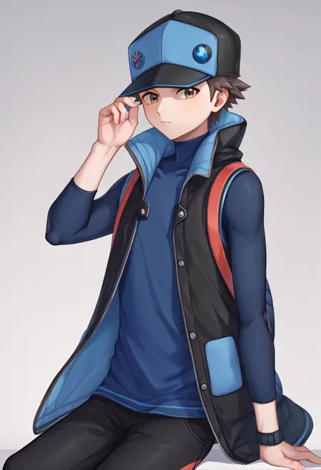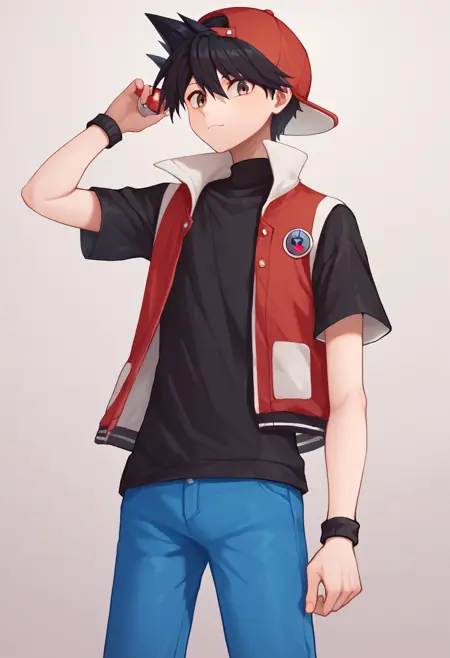 red_origins, brown hair, brown eyes, black shirt, red vest, blue pants, red with white baseball cap,