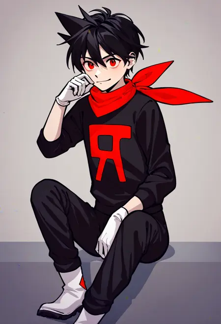 red_rt, red eyes, black hair, black headwear, red scarf, black jacket, black pants, white gloves, white boots, team rocket uniform,