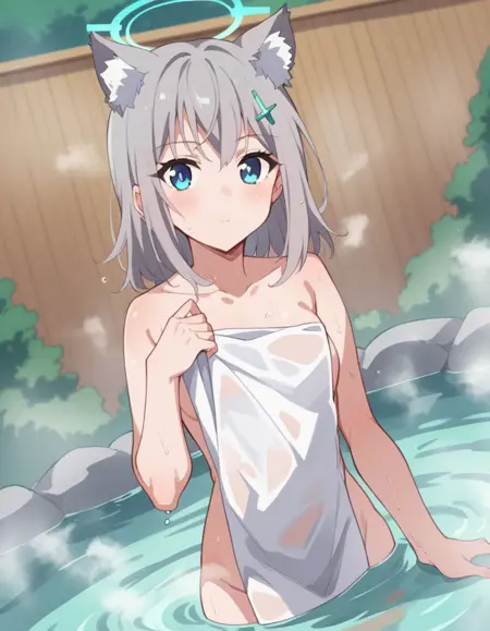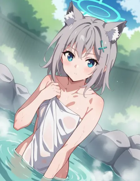 shiroko, animal ears, blue eyes, grey hair, hair ornament, hairpin, halo, medium hair, wolf ears,