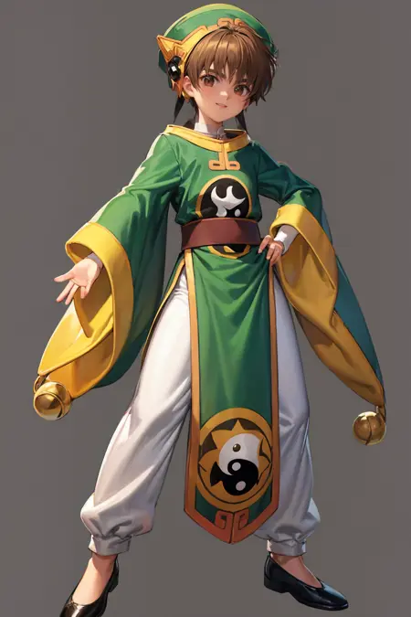 戦闘服プロンプト:green hat, cerominal clothes, battle costume, green chinese clothes, wide sleeves, white pants, shoes, ying yang