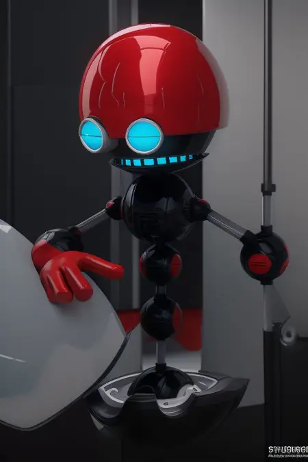 프롬프트: Orbot, 둥근 머리, 빨간 로봇, 빨간 머리 모자, 연한 파란 눈과 입, 정면도, 가슴은 볼 조인트, 손은 빨간 장갑, 팔과 등은 각각 두 개의 가느다란 막대로 이루어져 있으며 볼 조인트로 연결됨, 하체는 회색 내부를 가진 작은 반구형이며 등과 볼 조인트로 연결됨