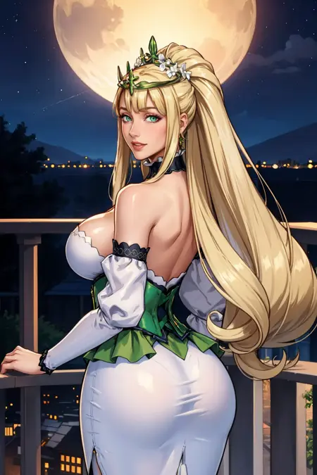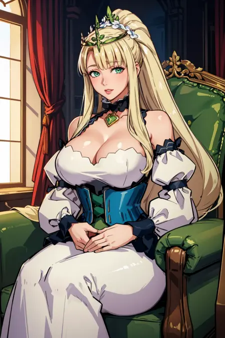 为展现她的典型形象,请添加 "tiara, hair flower, choker, cleavage, white dress, blue corset, detached sleeves, long dress"。