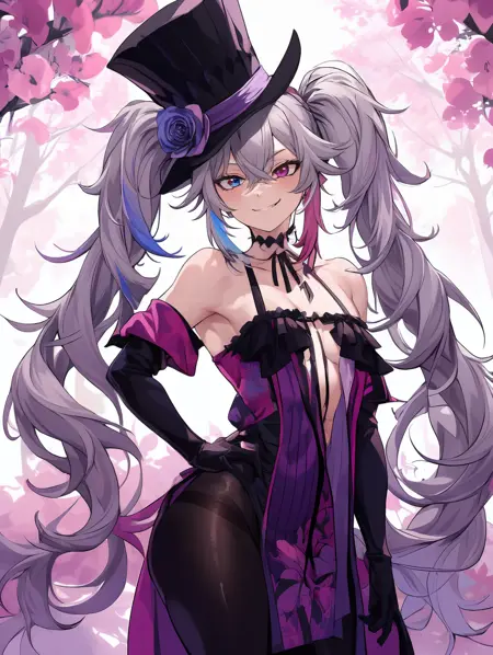 基础服装:粉紫色长袍,分色长袍,图案西装,黑色肘部手套,花卉图案,条纹,