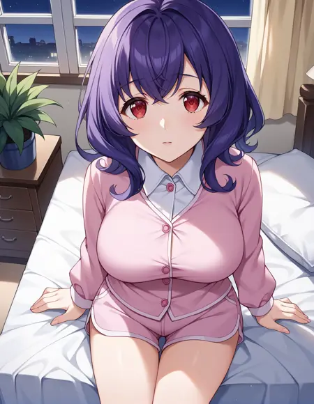 触发词:tomo yamanobe, 1girl, 紫发, 中长发, 红眼