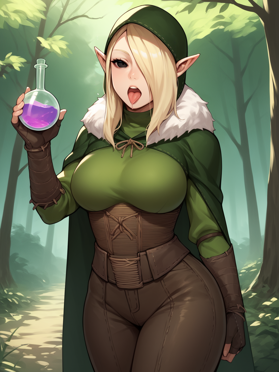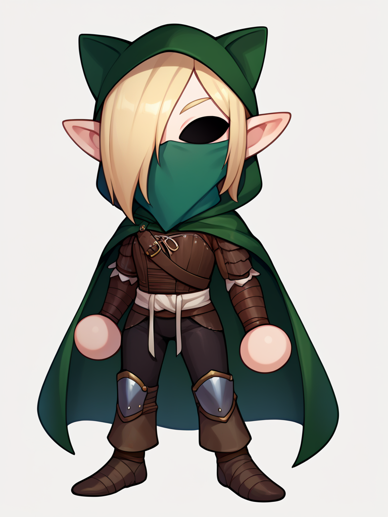 Outfit prompts : mask, hood, fur trim, cloak, leather pants, armor, fingerless gloves