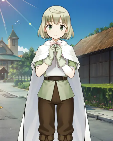 Travel outfit: pmmmtart, trttrv, short hair, white cloak, pink bowtie, [white chestplate], green tunic, short over long sleeves, white sleeves, light green gloves, brown belt, brown pants