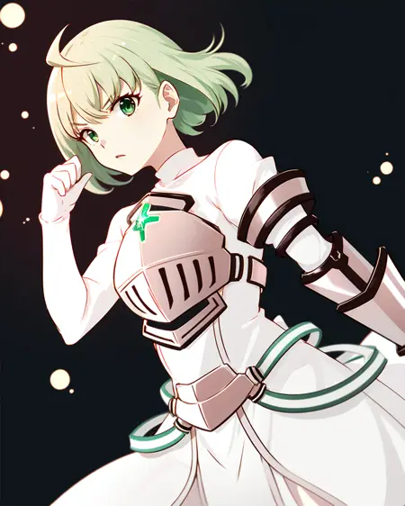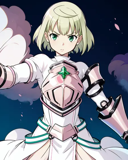 Magical outfit: pmmmtart, trtmgc, short hair, white turtleneck dress, green chest gem, puffy sleeves, pink breastplate, single pink gauntlet, pink tabard, white back bow, white belt, white pantyhose
