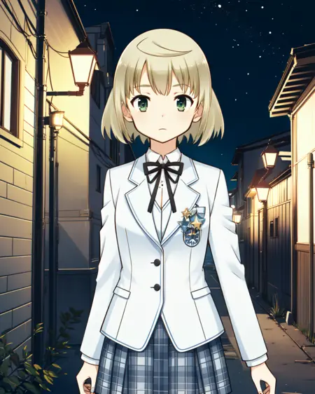 Uniform: pmmmtart, trtpbc, short hair, white shirt, black neck ribbon, white blazer, light blue plaid skirt, white pantyhose