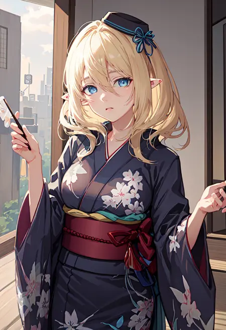 - 축소된 캐릭터 태그는 금발 머리, 모자, 긴 머리, 파란 눈, 뾰족한 귀, 검은 머리장식, 눈 사이의 머리카락입니다. 캐릭터의 핵심 특징(예: 머리카락 색상)이 안정적이지 않을 때 이러한 태그를 프롬프트에 추가할 수 있습니다.