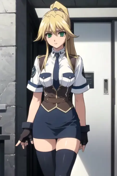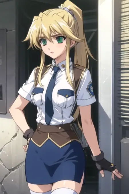 RioKinezono, 1girl, solo, long hair, ponytail, miniskirt, blonde hair, white thighhighs, green eyes, necktie, belt, fingerless gloves, police uniform, white thighhighs, pencil skirt, police uniform,