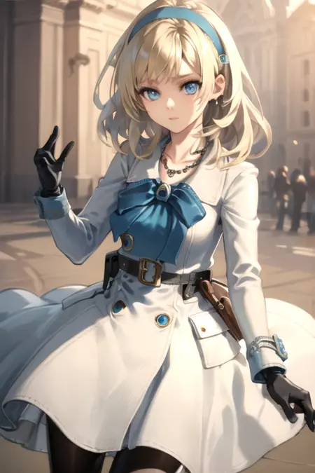 LeanneReanbell, 1girl, solo, long hair, blue eyes, blonde hair, black gloves, dress, bow, jewelry, pantyhose, hairband, belt, necklace, coat,
