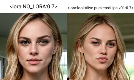 Look alive!는 일관된 캐릭터 LoRA 및 임베딩과 함께 사용하도록 설계된 내 얼굴 표정 LoRA 시리즈입니다. 이 특정 LoRA는 입술을 꼬집은 얼굴 표현용입니다.