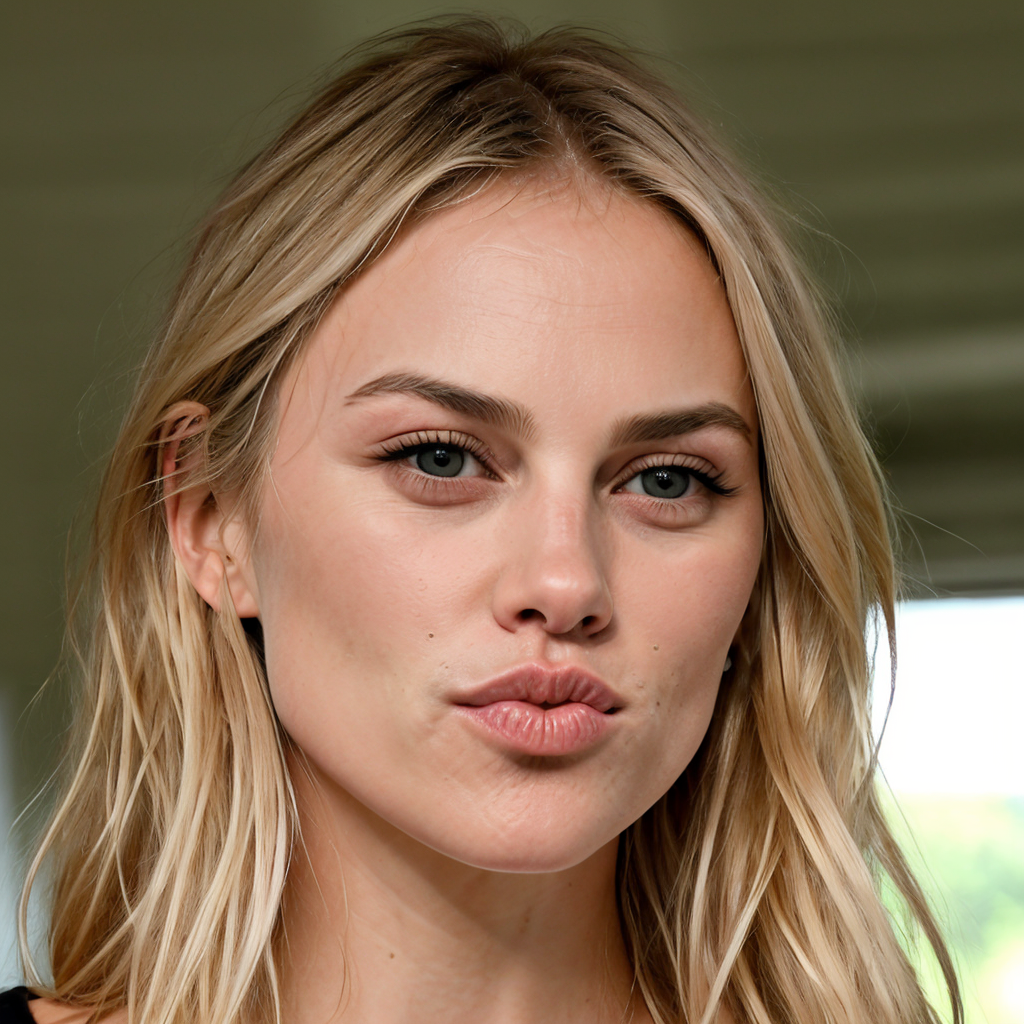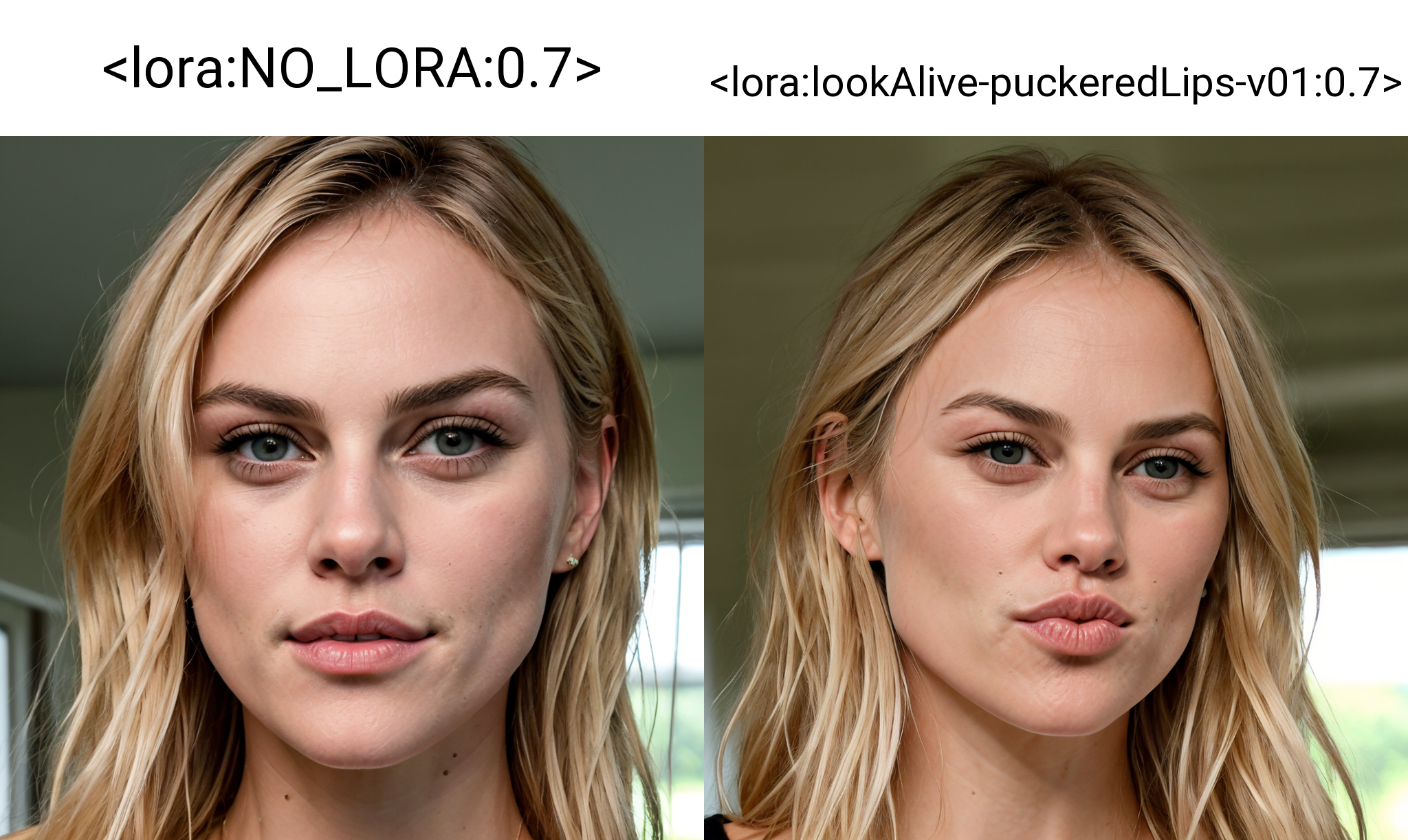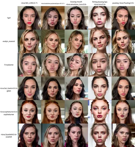 最后一列代表 "Puckered Lips Helper" LoRA。你可以看到它生成的“噘嘴表情”优于我的 LoRA,但引入了大量图像改动。最显著的是,所有角色似乎都涂了过量妆容、嘴唇明显增大、下颌轮廓被改变。我怀疑该 LoRA 训练数据集中,同一个人(拥有大嘴唇和浓妆)在过多图像中重复出现。