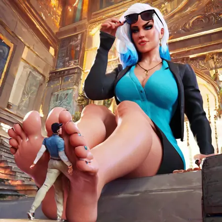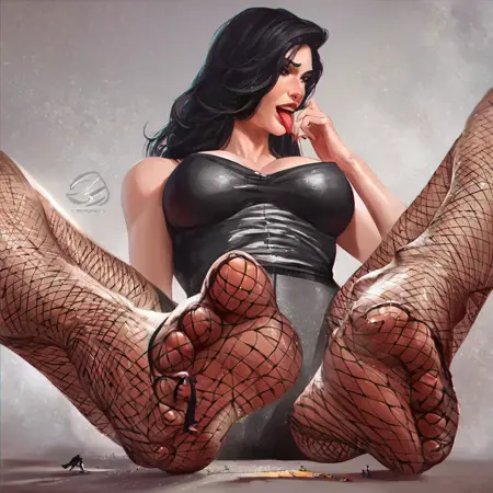 Between feet (illustrious): Images in which a tiny person is pressed between a giantess' feet.
