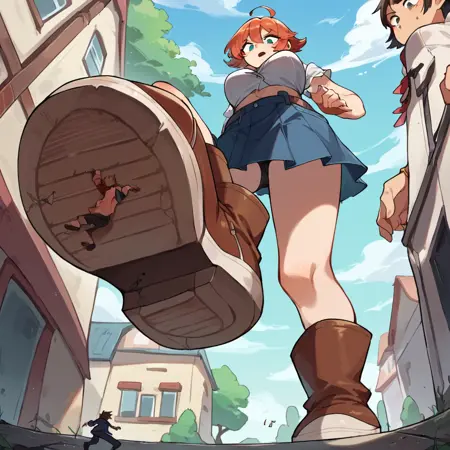 Imminent stomp (illustrious): Images in which a tiny person is under a giantess' foot, usually with the implication that she is about to step on them.