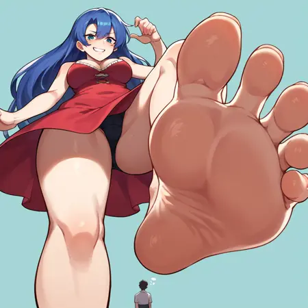 即将踩踏(Illustrious):渺小人物位于巨女脚底,通常暗示她即将踩下去的图像