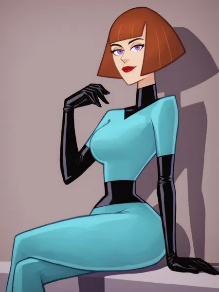 be sure to tag all the usual Maddie character traits as you want them to appear. The LoRA knows them as the following: auburn hair, purple eyes, red lips, bob cut, blue rubber jumpsuit, black hip holster, utility pouch, black gloves, black boots