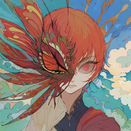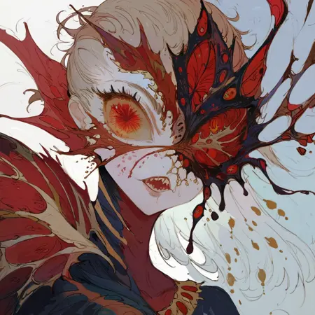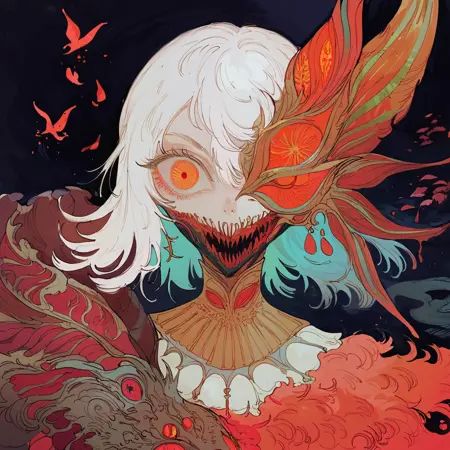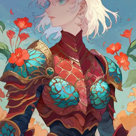 Style tag - mm0n. Optional - dark background, colorful background, dark dress, armor, infected face (really powerful), flower armor, colorful dress.