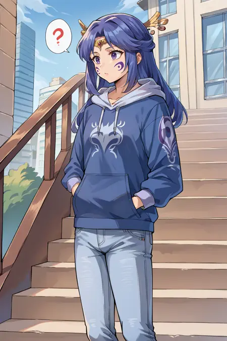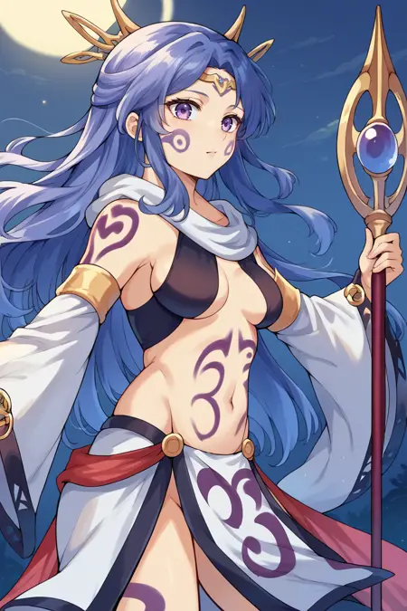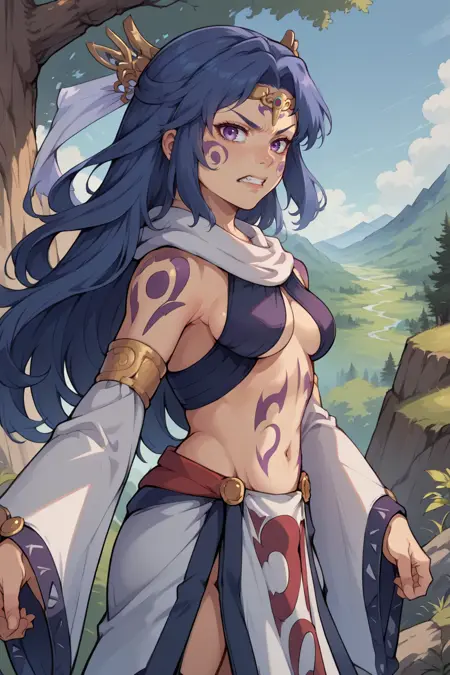 - Add "facial mark, tattoo, circlet, hair ornament, scarf, revealing clothes, navel, detached sleeves, pelvic curtain" for her typical look.