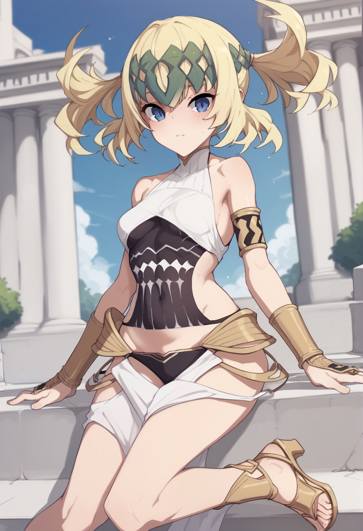 Notable tags: medium hair, blonde hair, blue eyes, diadem, bare shoulders, bracer, armlet, bracelet, jewelrey, halterneck, covered navel, underwear, panties, black panties, robe, sandals