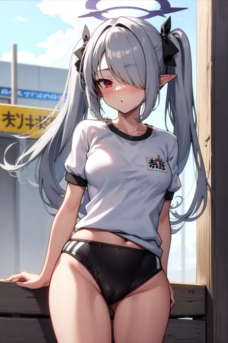 appearance: iori, red eyes, dark skin, grey hair, hair over one eye, very long hair, twintails, hair ribbon, pointy ears, demon tail, halo