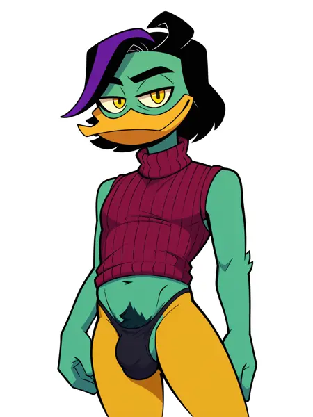 poe de spell, male, duck, beak, black hair, short hair, purple highlights, yellow eyes, green skin, green body, white skin, white body, orange legs, webbed feet, eye bags, short tail, scut tail, slim, small waist