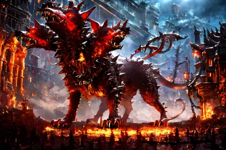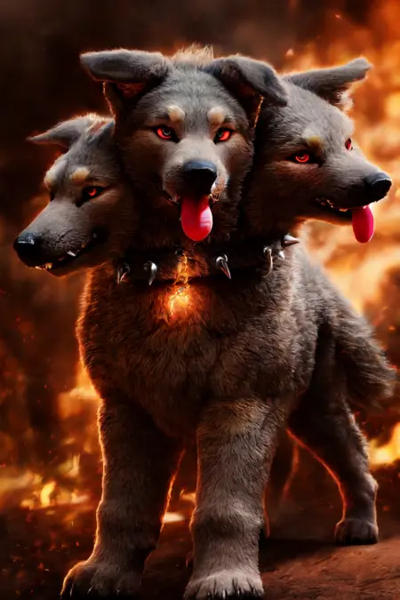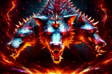 触发词:张开的嘴,无人类,牙齿,锋利的牙齿,尖牙,发光,发光的眼睛,火焰,动物,爪子,狗,怪物,舌头,项圈,尖刺,红眼睛,链条,三头,带刺项圈,狼,尾巴