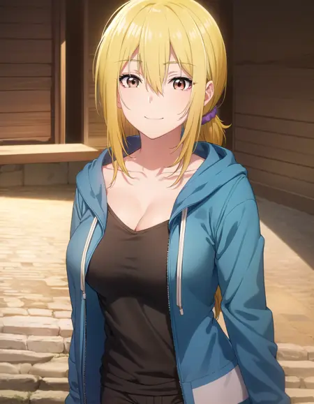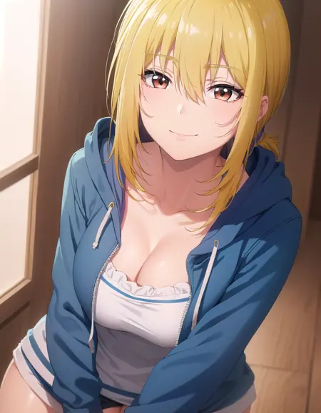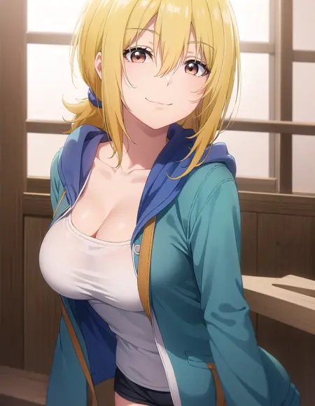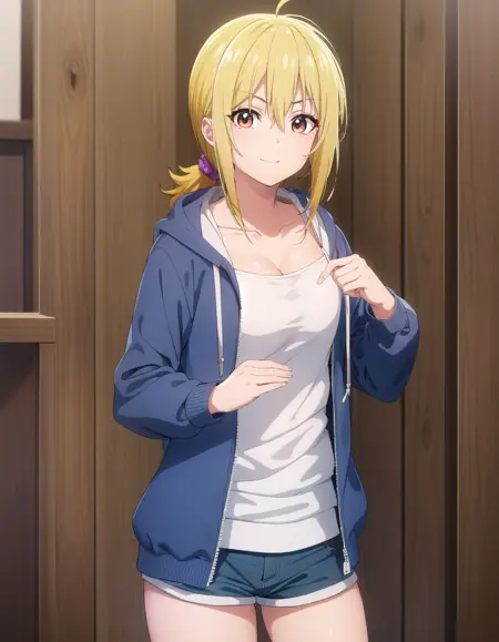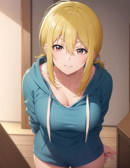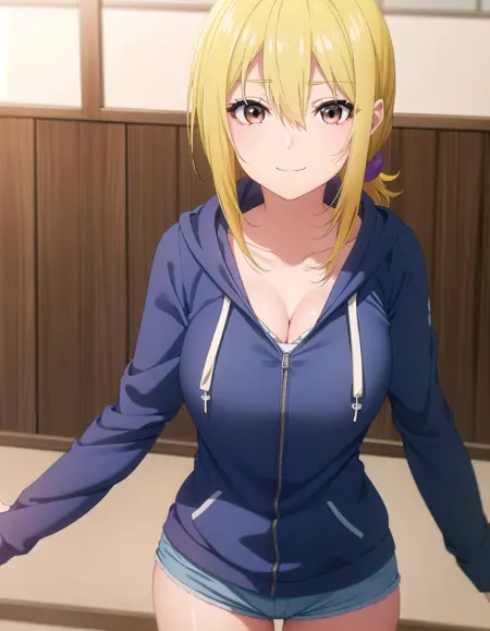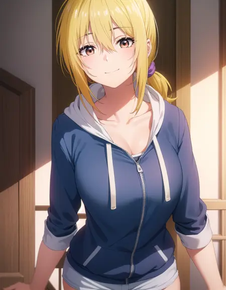 tsukuyo aoba, blonde hair, hair between eyes, (brown eyes:1.5), ahoge,