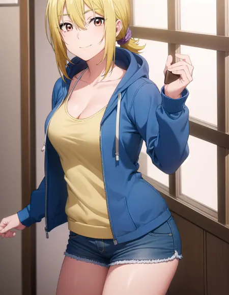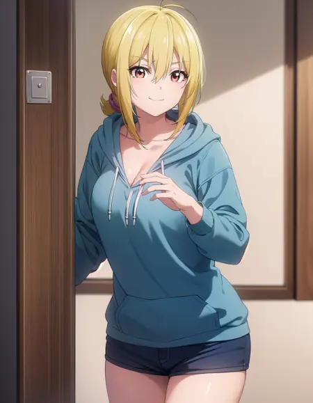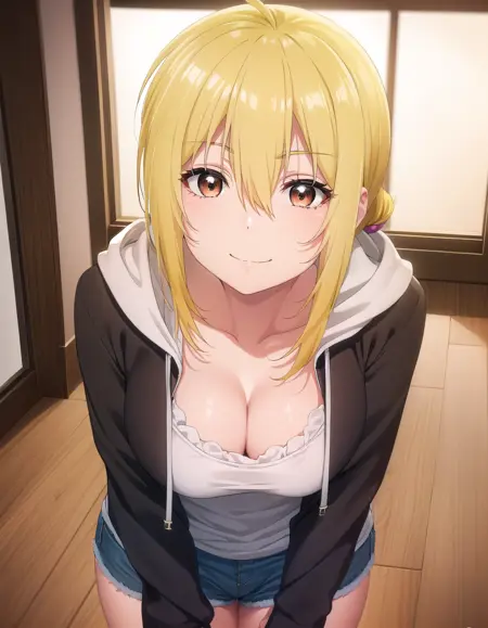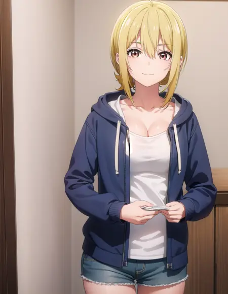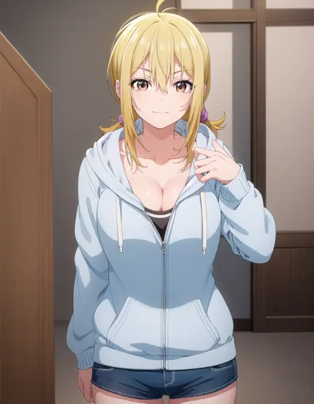 cleavage, collarbone, shorts, hood, short shorts, hoodie,