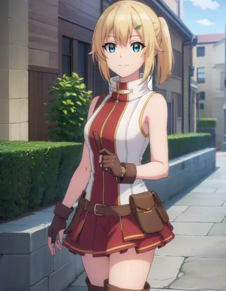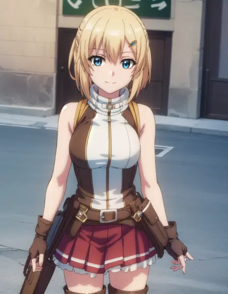 skirt, gloves, boots, sleeveless, socks, fingerless gloves, red skirt, brown footwear, brown gloves,