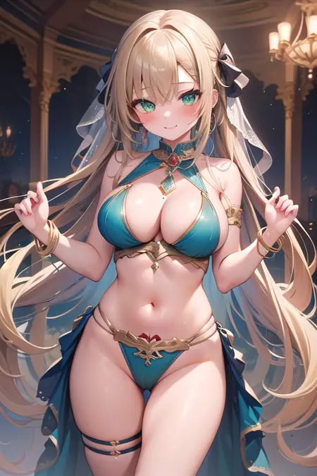 (dancer-outfit), pelvic curtain, dancer, veil, mouth veil, jewelry