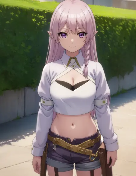 luna heela, 長い髪, 前髪, (紫の瞳:1.1), ピンクの髪, 編み髪, 尖った耳, エルフ, 片側編み髪,