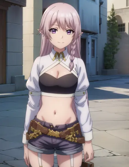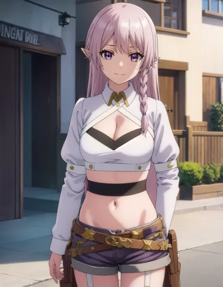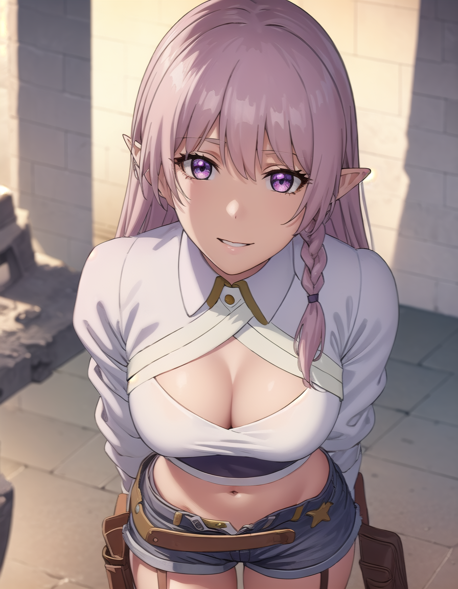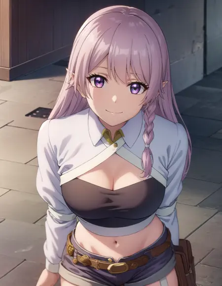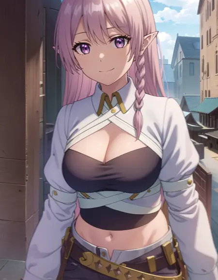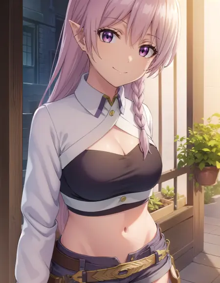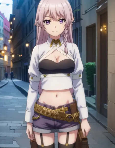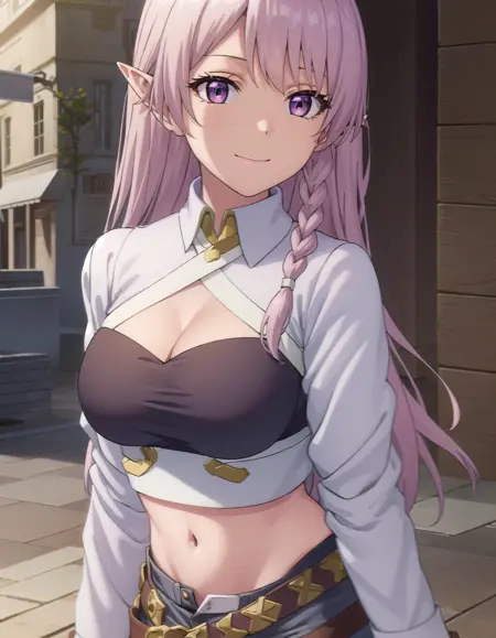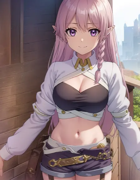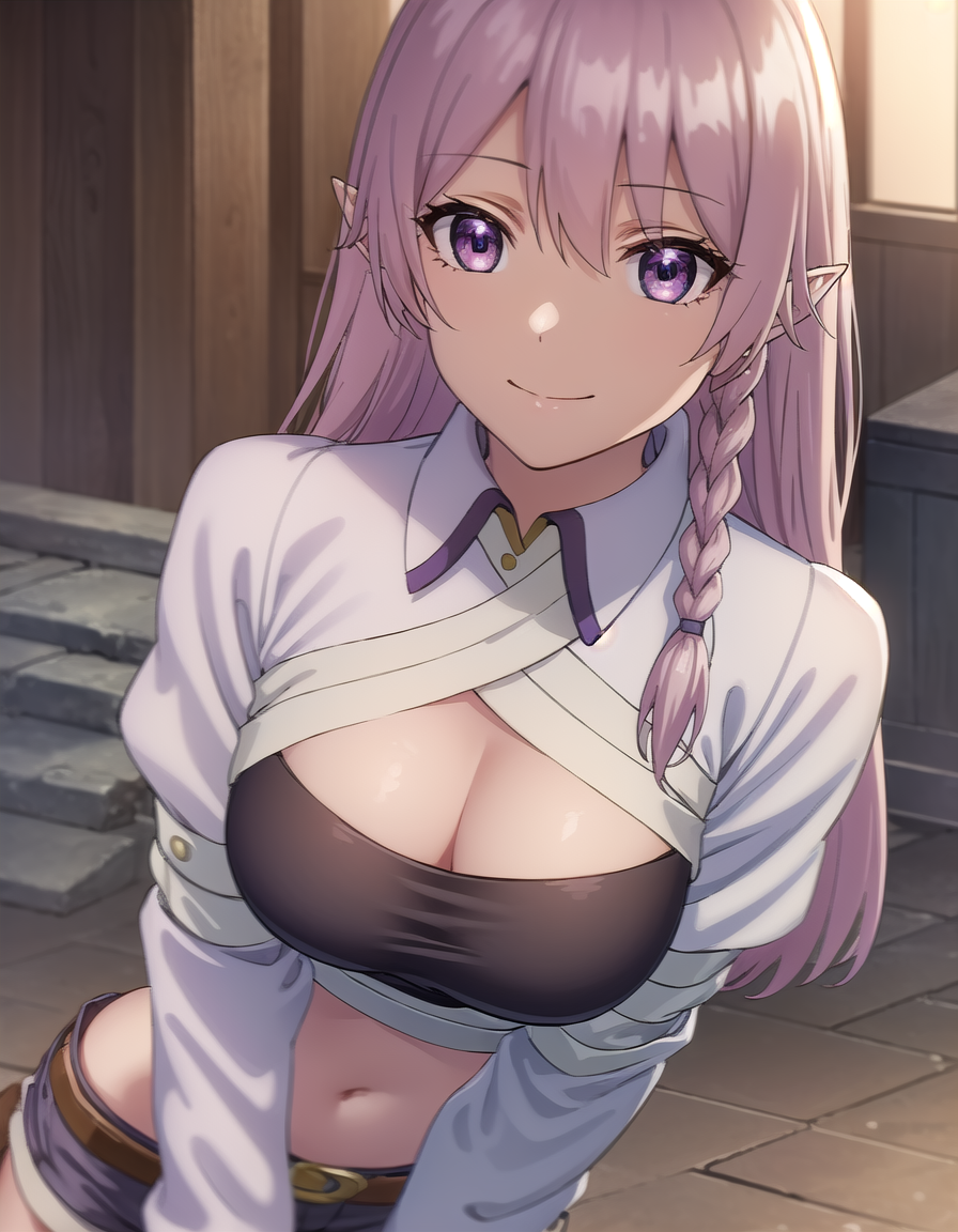 luna heela, 긴 머리, 앞머리, (보라색 눈:1.1), 분홍색 머리, 땋은 머리, 날카로운 귀, 엘프, 옆머리 땋기,