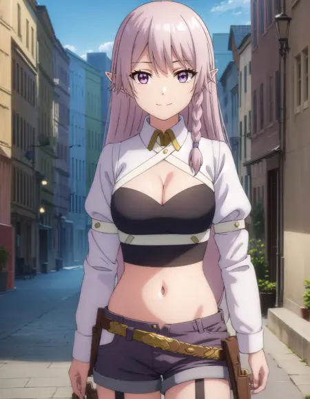 셔츠, 허벅지까지 긴 양말, 긴 소매, 배꼽, 가슴선, 반바지, 허리 부분, 벨트, 검은 허벅지까지 양말, 크롭탑, 짧은 반바지, 게터 스트랩, 파란 반바지,