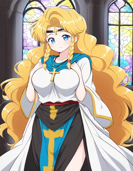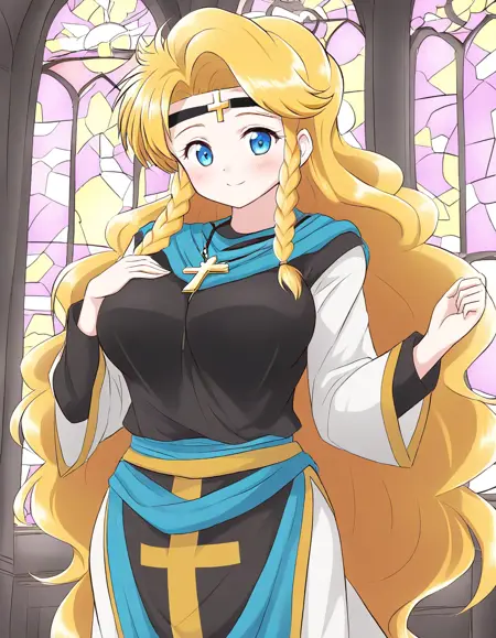 Linda(DKM), 1girl, solo, 금발, 긴 머리, 파란 눈, 원형 머리장식, 두 줄 땋은 머리, 거대한 가슴,