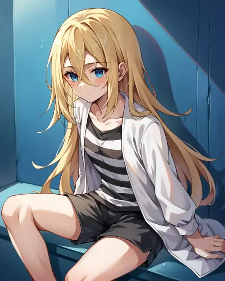 rachel gardner, 1girl, solo, long hair, blonde hair, blue eyes, hair between eyes, open jacket, striped shirt, white jacket,black shorts,