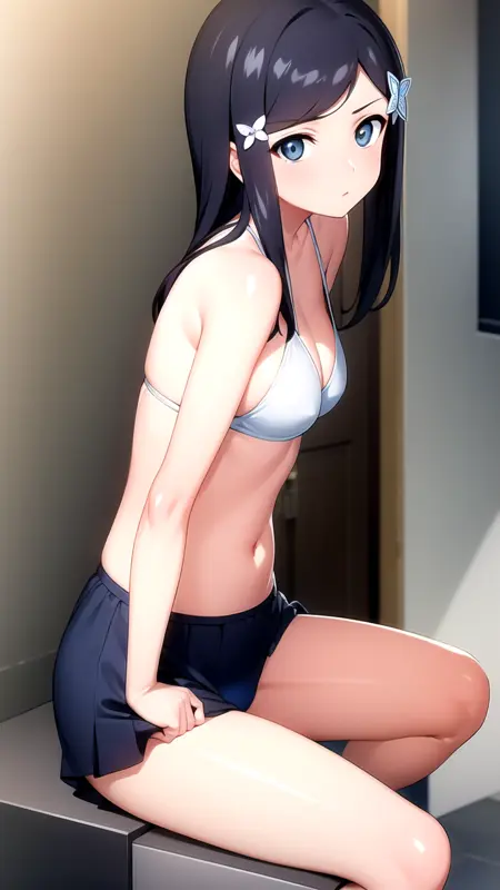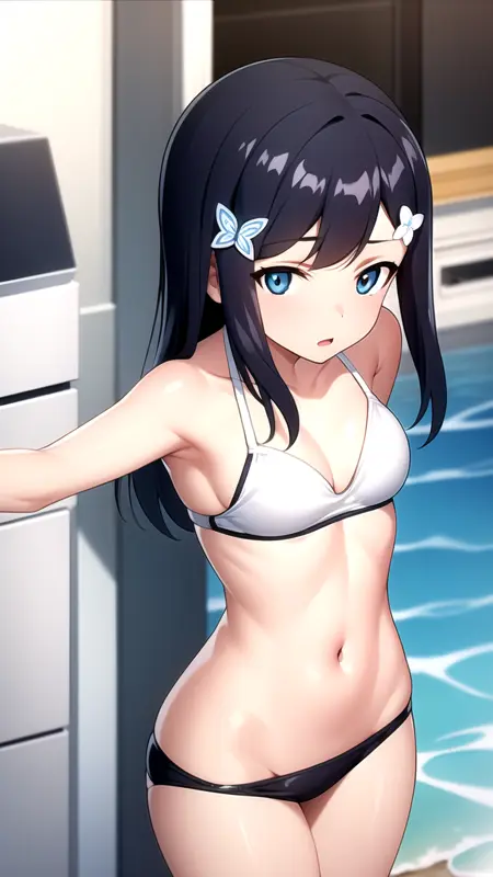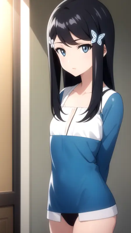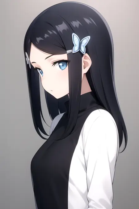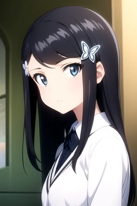 Mitsuha Yamano, long black hair, bangs, long sideburns, butterfly hair ornament, flower hair ornament, bright blue eyes,girl,