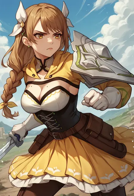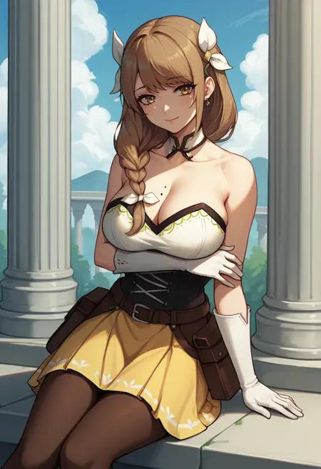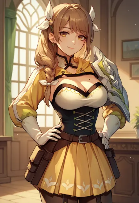 Default outfit: defGoldmary, looking at viewer, smile, braid, hair ribbon, black corset, cleavage, large breasts, mole on breast, gloves, shoulder armor, single pauldron, yellow skirt, pantyhose