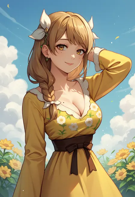 Somniel outfit: casGoldmary, hair ribbon, braid, cleavage, mole on breast, waist ribbon, long sleeves, floral print, yellow dress