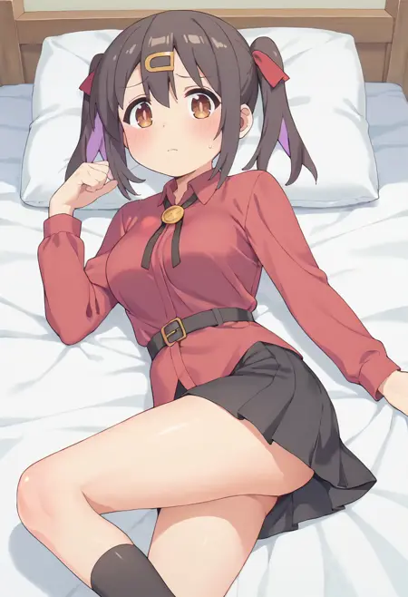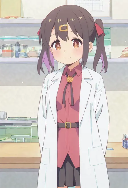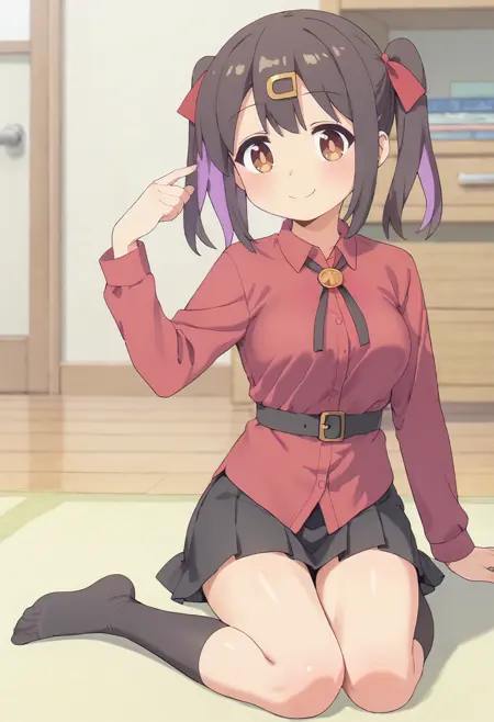 mihari-default, oyama mihari,,brown eyes,black hair,multicolored hair,twintails,red hair ribbon,hairclip,labcoat,red shirt,long sleeves, (belt:0.7),black neck ribbon,black skirt,black socks