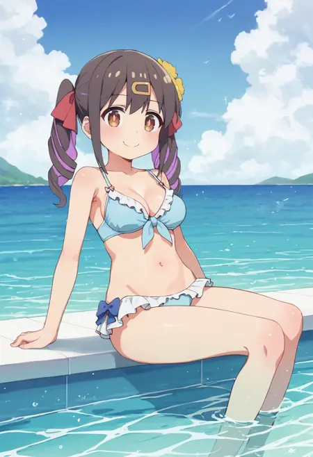 (mihari-swm:1.1),oyama mihari,brown eyes,black hair,multicolored hair,twintails,twin drills,red hair ribbon,yellow_hair_flower,hairclip,frilled bikini,sandals