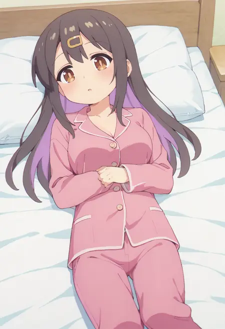 mihari-default, oyama mihari,,brown eyes,black hair,multicolored hair,straight hair,long hair,hairclip,pink pajamas,pink pants